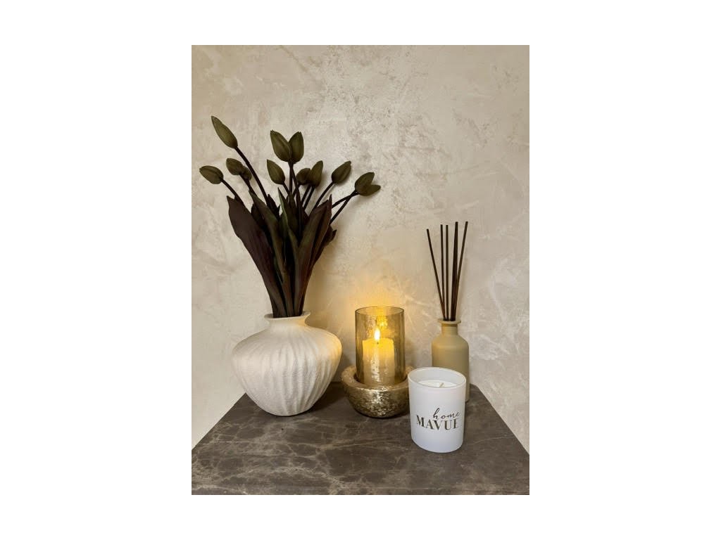 Hand-poured glass candle by MAVUE, designed to fill your home with an extraordinary floral fragrance. Available in two variants – milky white and powder pink. The candle comes with a wooden lid for easy flame extinguishing.